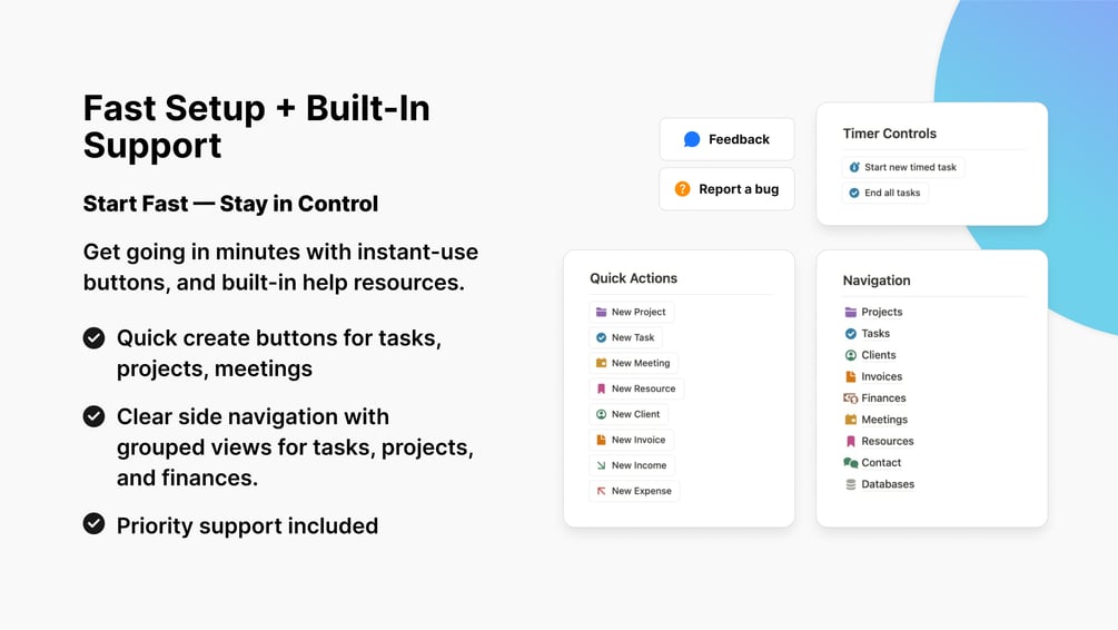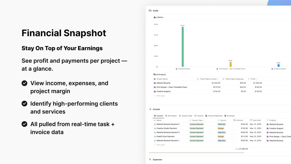 Freelance Business OS is ready to use right away, so you can start managing clients, projects, and finances without extra setup. While we don’t take on one-off custom builds or major changes, we do fix any bugs and sometimes add small tweaks if they fit naturally with the template. If you’ve got a suggestion, share it with us — it might make its way into a future update.
