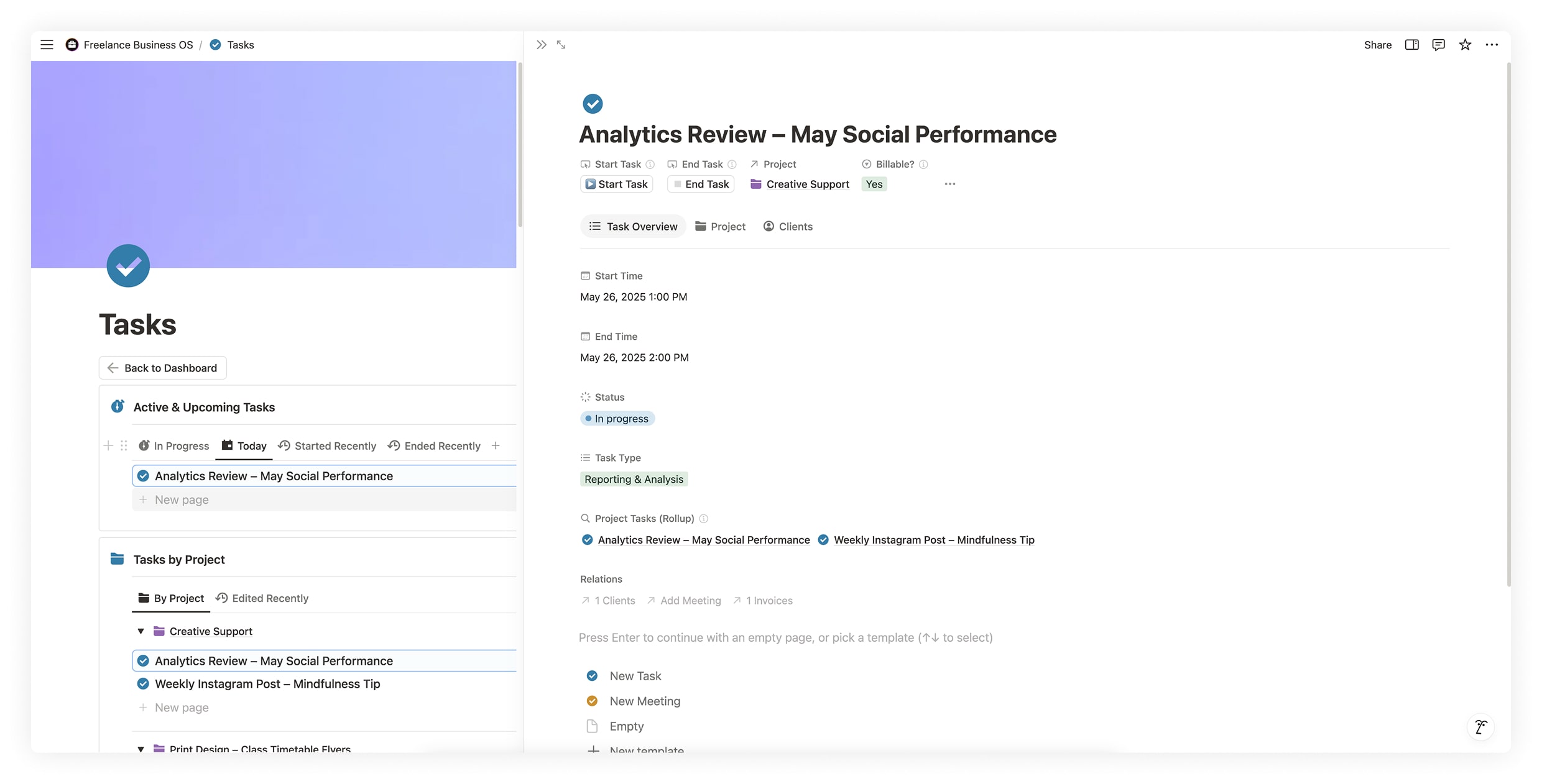 Freelance Business OS is a complete system built in Notion to help you manage clients, projects, tasks, time, and finances — all from one streamlined dashboard. Track work hours with the built-in time tracker, generate smart invoices automatically, and monitor your earnings with clear income and expense views. Whether you’re a solo creative or full-time freelancer, this workspace is built to help you stay focused, bill smarter, and get more done.