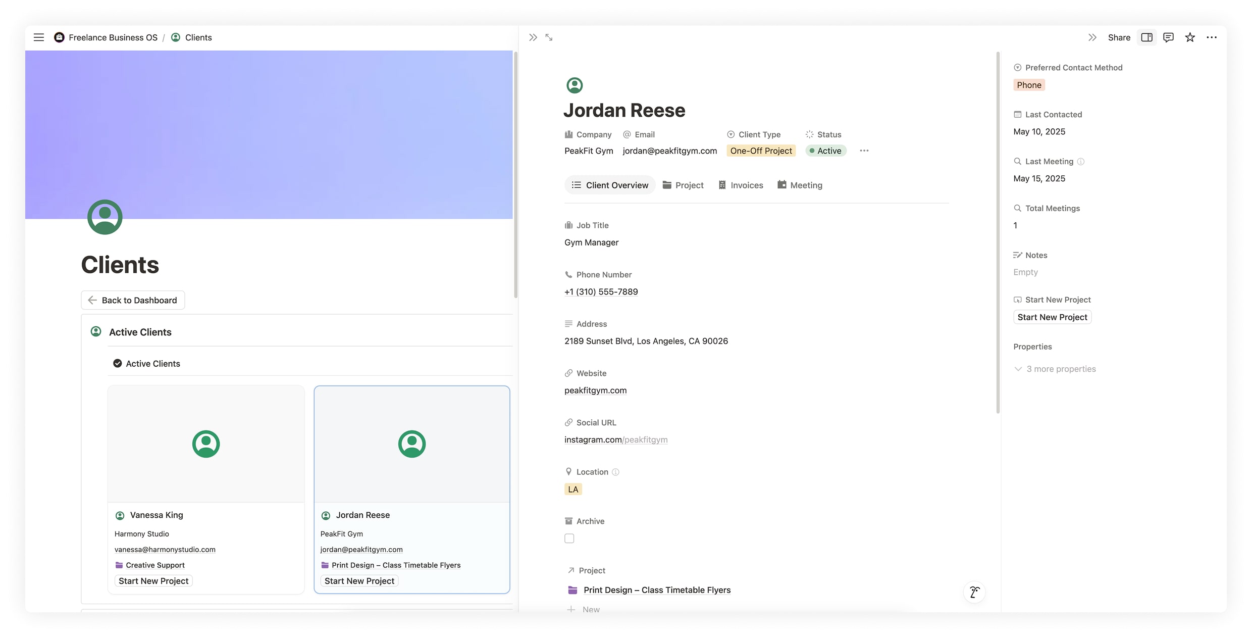 Track client details, communication history, and linked tasks, invoices, and income — all from a single connected profile.