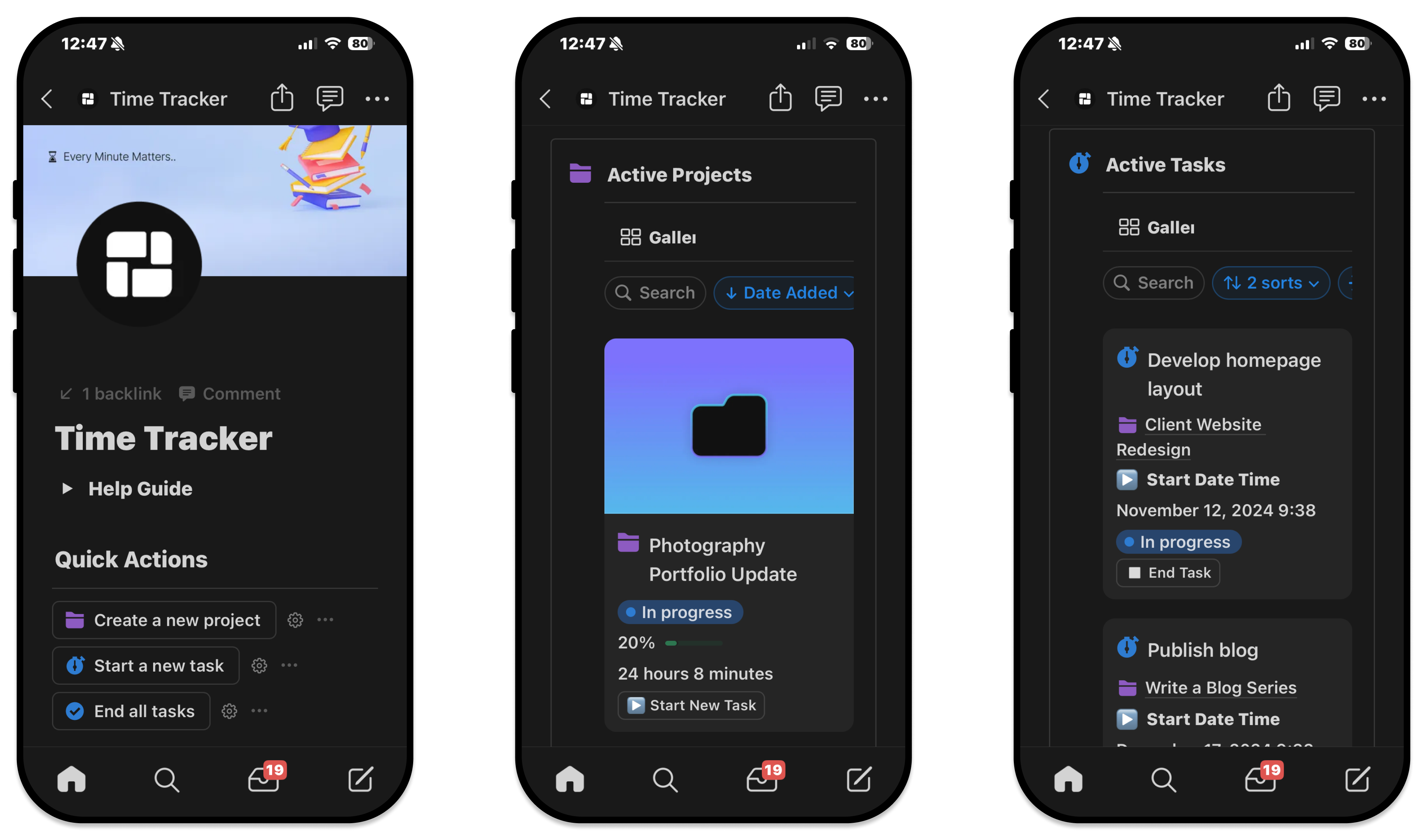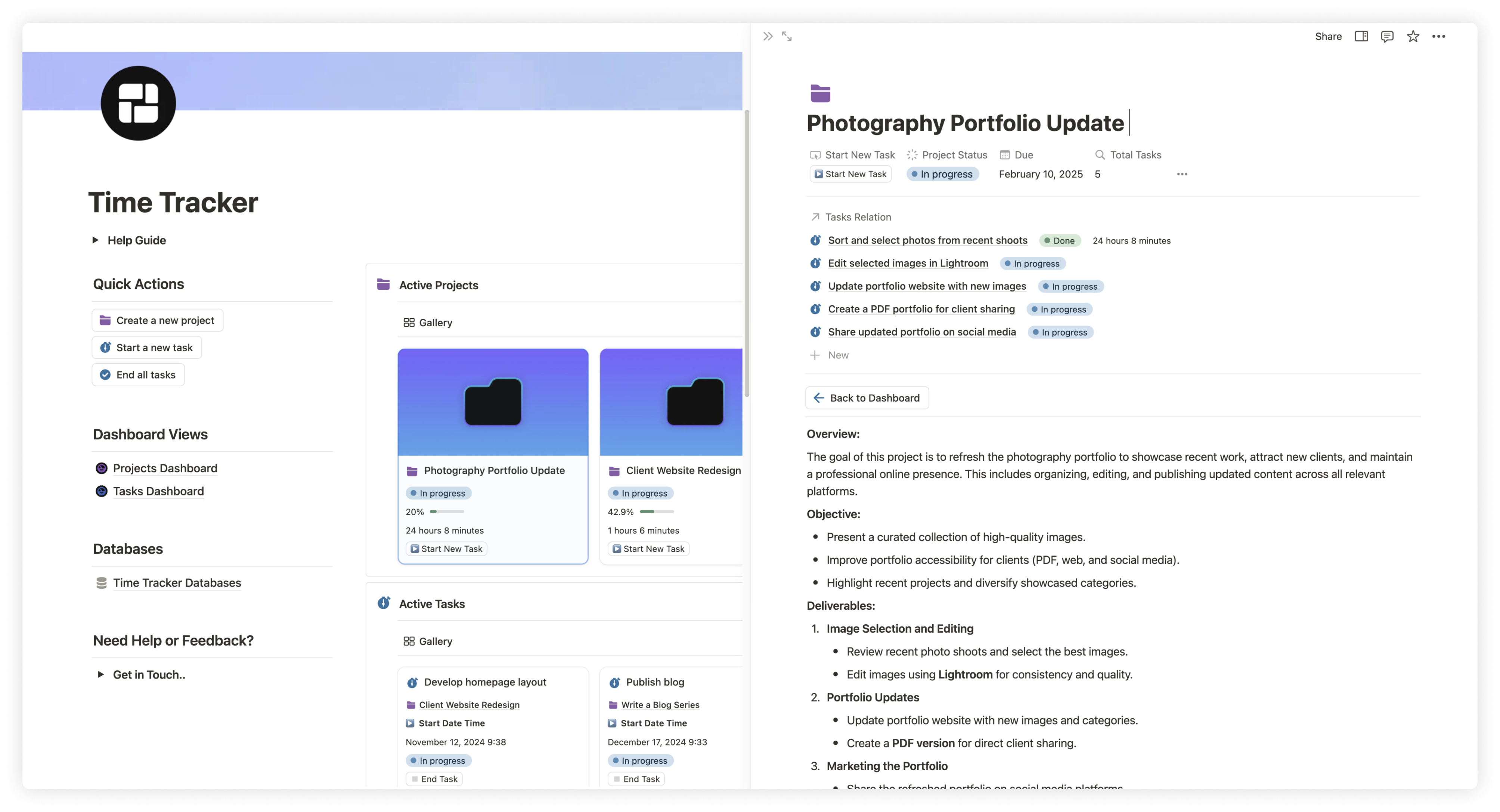 You’ll receive a powerful all-in-one Notion template, designed to simplify every aspect of time tracking and task management. Whether you’re managing multiple projects, tracking tasks, or monitoring time spent, this integrated system helps you stay effortlessly organized. Tailored for freelancers, students, and busy professionals, this template boosts your productivity while helping you focus on what matters most. With its intuitive dashboards and seamless task-to-project integration, you can spend less time juggling details and more time achieving your goals.