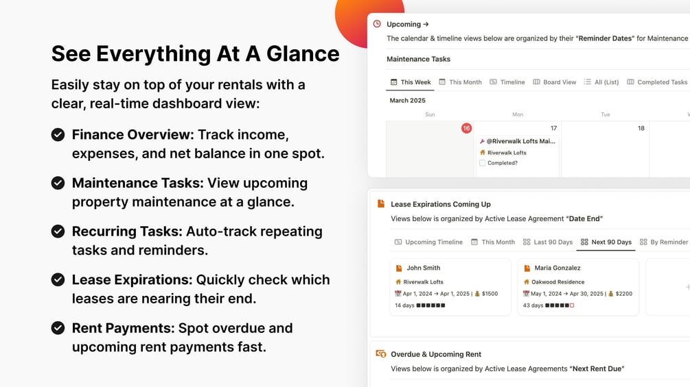 Dashboard Overview - Quickly see the big picture: financial summaries, upcoming tasks, lease expirations, and overdue rental payments - all at a glance.