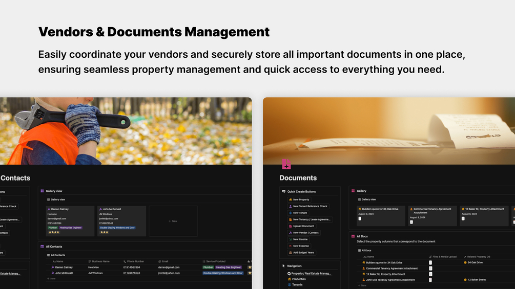 - Vendor & Service Database: Maintain vendor and service provider details, so you can coordinate maintenance and other services efficiently.