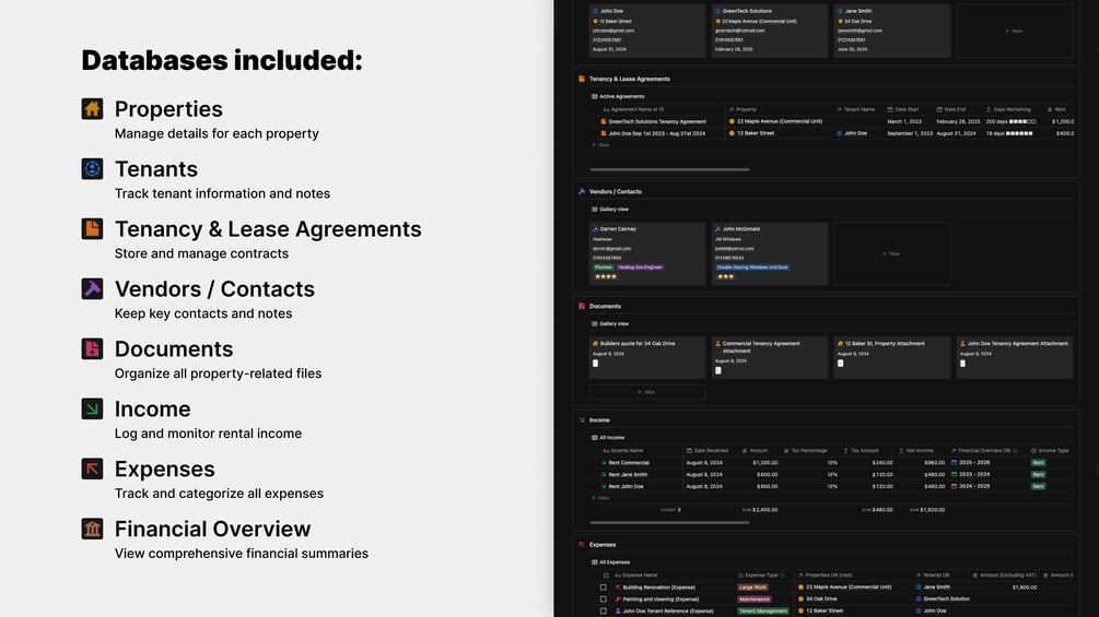Whether you’re a landlord, real estate investor, or property manager in the UK, USA, or anywhere globally, this customizable Notion template offers a bird’s-eye view of your entire real estate and rental property management portfolio. This all-in-one dashboard allows you to track tenants, manage leases, organize rental income, monitor expenses, and coordinate vendors effortlessly, ensuring you stay on top of your property management tasks.